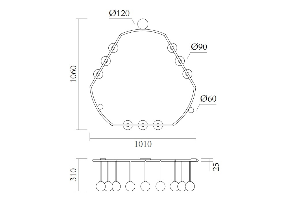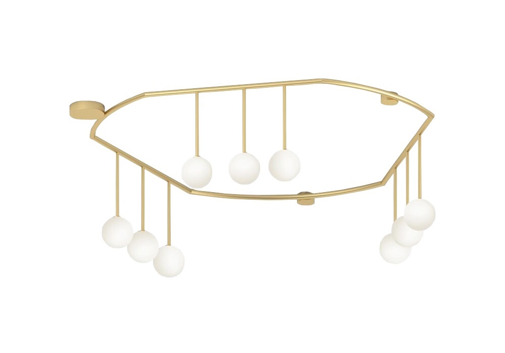 Standing Globes conçu par Atelier Areti est un plafonnier en laiton brossé ou nickel et 9 globes en verre blanc.