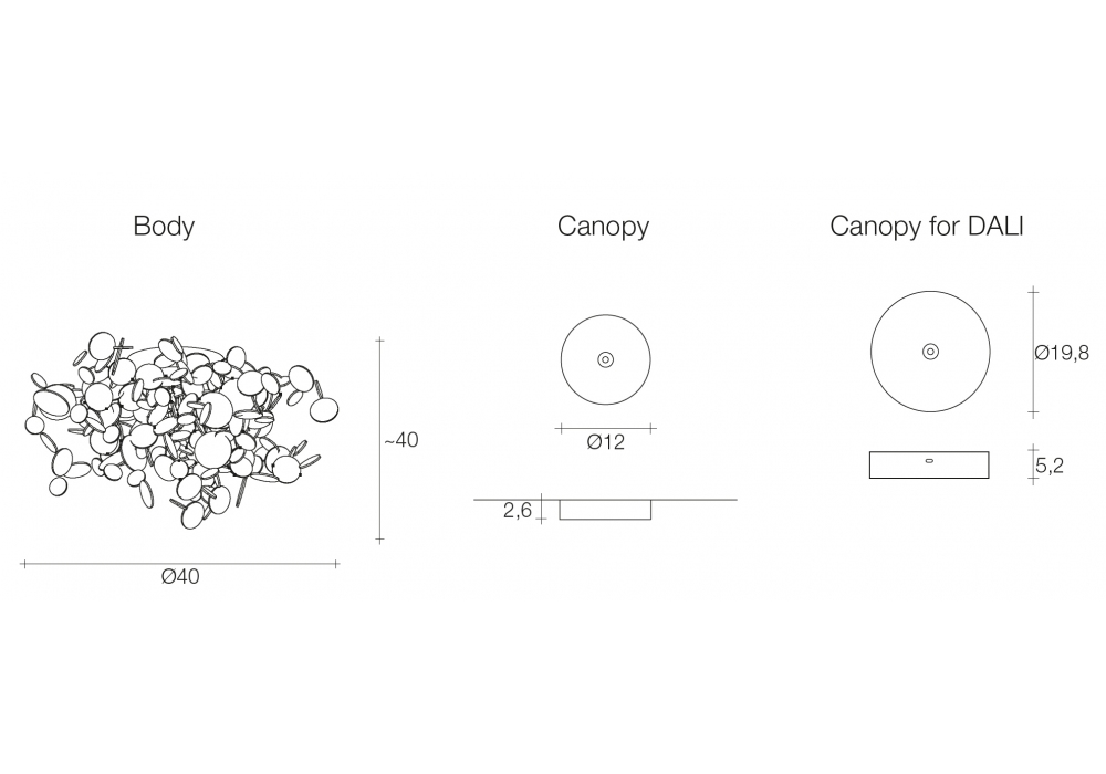 | Plafond rose | Ø 12 x H 2,6 Kg (no Dimm.); Ø 19,8 x H 5,2 Kg (Dimm Dali.). |