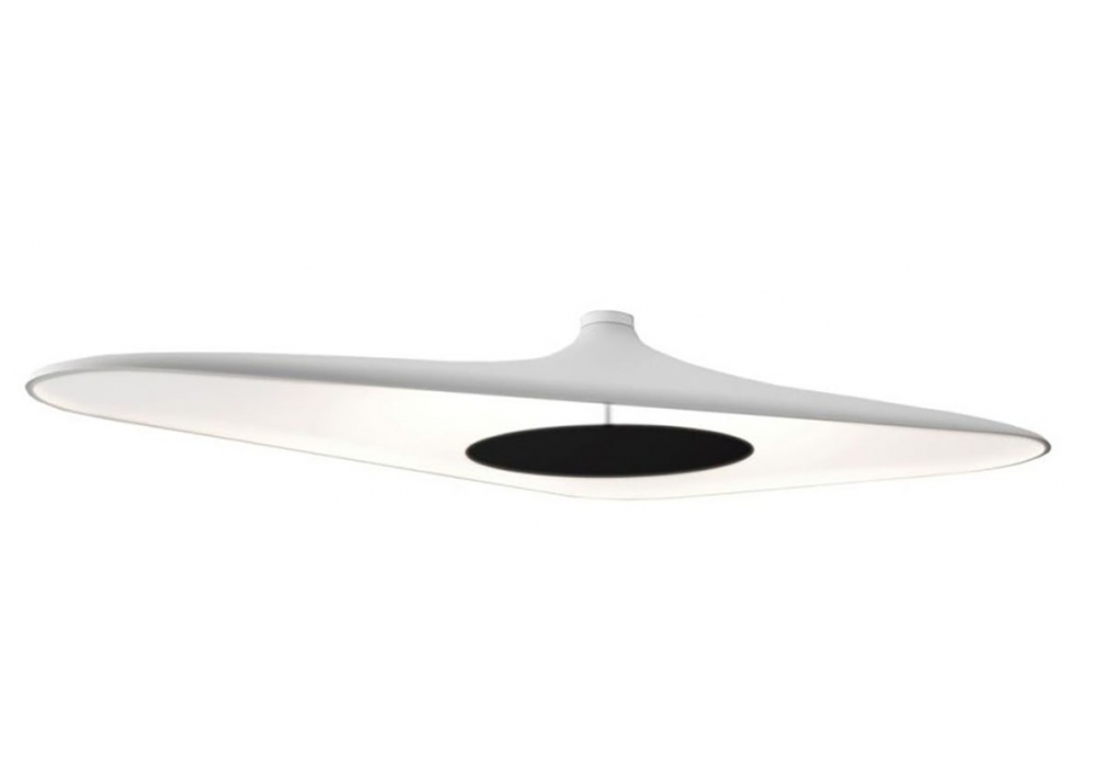 Soleil Noir conçu par Odile Decq pour Luceplan est un plafonnier LED en mousse de polyuréthane imprimée dans une finition blanche ou noire.