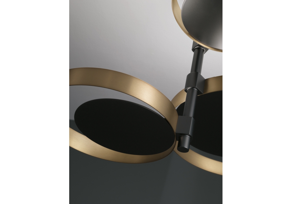 Circle conçu par Massimo Tonetto pour Venicem est un plafonnier à lumière indirecte. Anneaux en laiton bruni clair et structure en nickel noir mat. Disponible dans la version avec kit variateur et rosace.