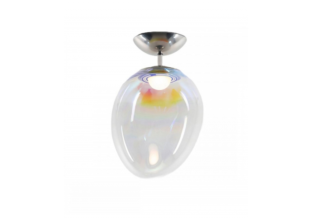 Stellar Nebula conçu par BIG pour Artemide est un plafonnier avec rosace en aluminium et corps de lampe circulaire en verre soufflé avec traitement PVD. Le diffuseur est de forme arrondie et également en verre soufflé et protège une source de lumière LED avec système de gradation Push.