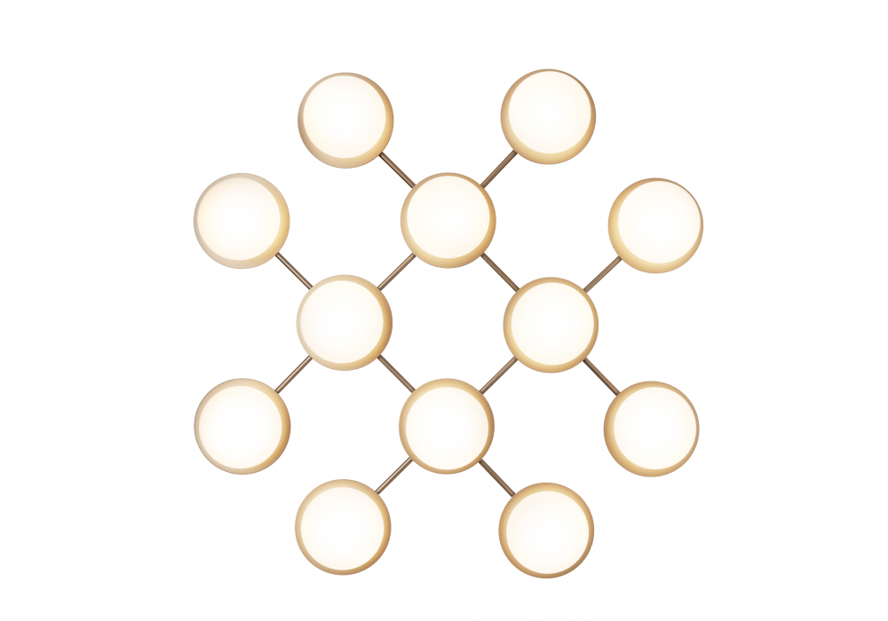 Liila conçue par Sofie Refer pour Nuura est une applique/plafonnier modulaire avec structure en métal et diffuseurs en verre opalin ou transparent soufflé bouche avec motifs en relief.