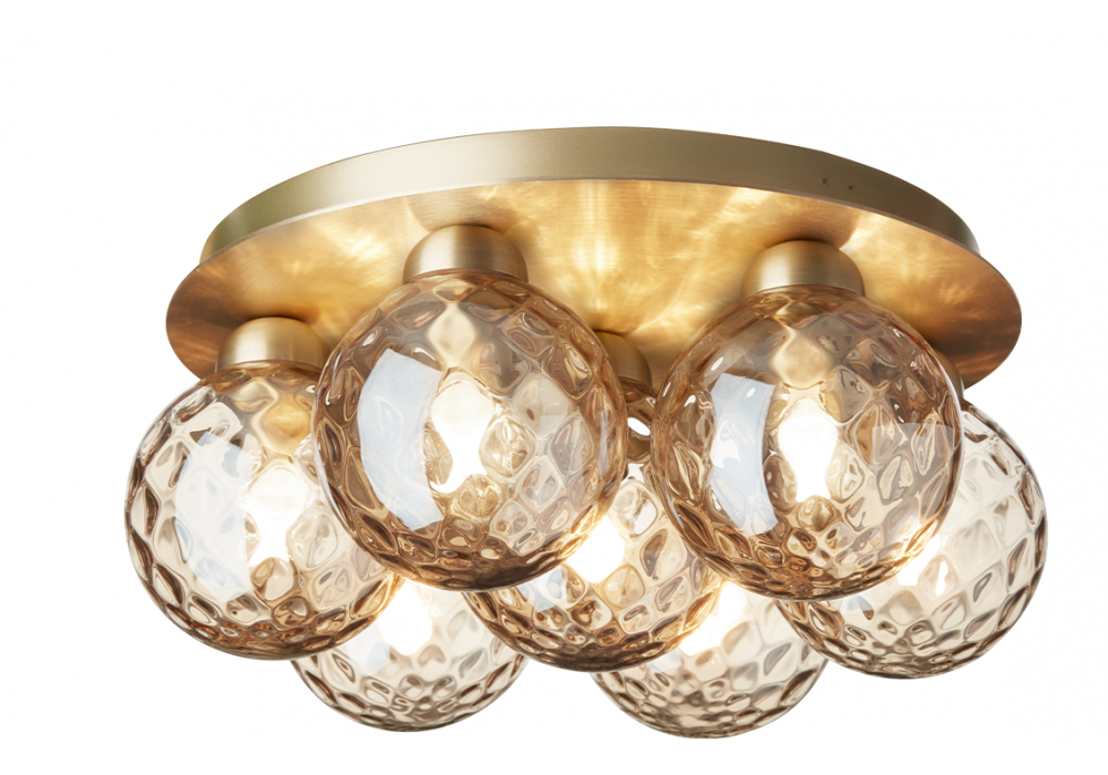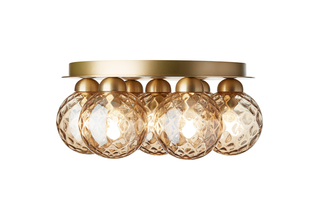 Apiales 7 Plafond conçu par Sofia Refer pour Nuura est un plafonnier circulaire avec structure en métal finition laiton brossé et 7 diffuseurs sphériques en verre.