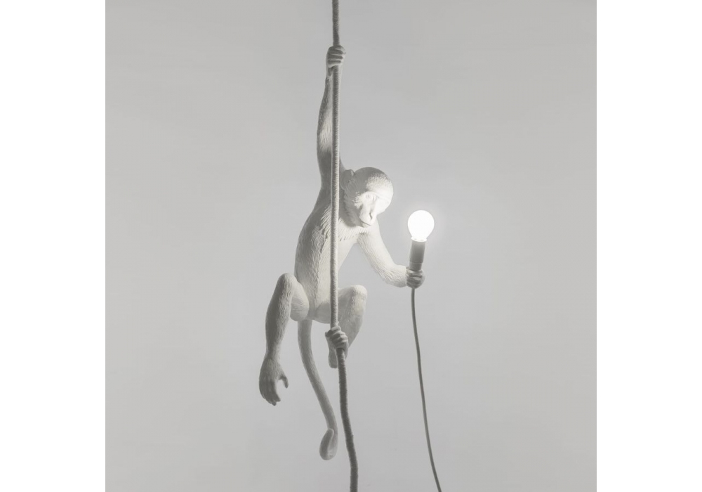 La Monkey Lamp conçue par Marcantonio Raimondi Malerba pour Seletti est un plafonnier réalisé en résine blanche et soutenu par une corde en tissu. La source lumineuse adoptée est de type LED à filament.