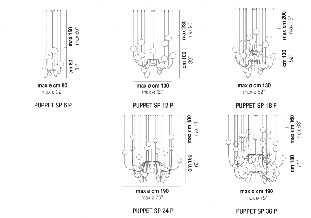 Puppet conçu par Romani Saccani pour Vistosi est un lustre avec structure portante en métal peint. Les diffuseurs sont sphériques en verre et adoptent une source lumineuse LED G9 ou halogène dimmable. La marionnette est disponible en différentes finitions et modèles.