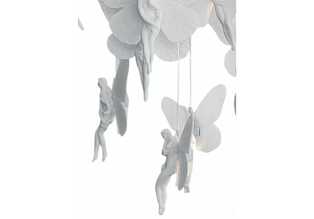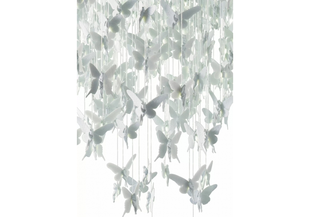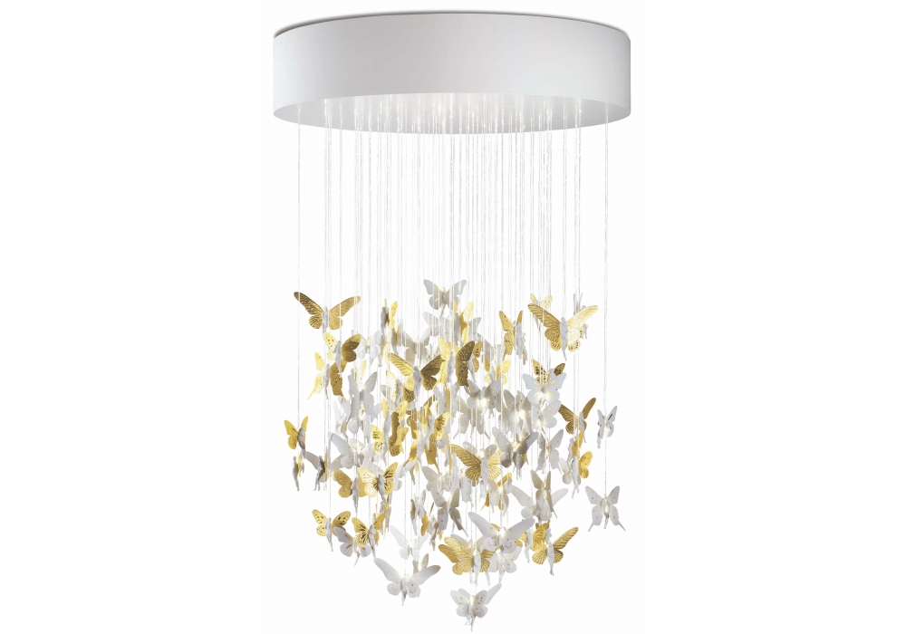 Niagara sculpté par Dept. Diseño y Decoración et conçu par Bodo Sperlein pour Lladró est un lustre cylindrique soutenu par une structure métallique en différentes finitions. Les suspensions sont accrochées sur des câbles en fibre optique entièrement fabriqués et peints à la main. Niagara est disponible en différentes tailles.