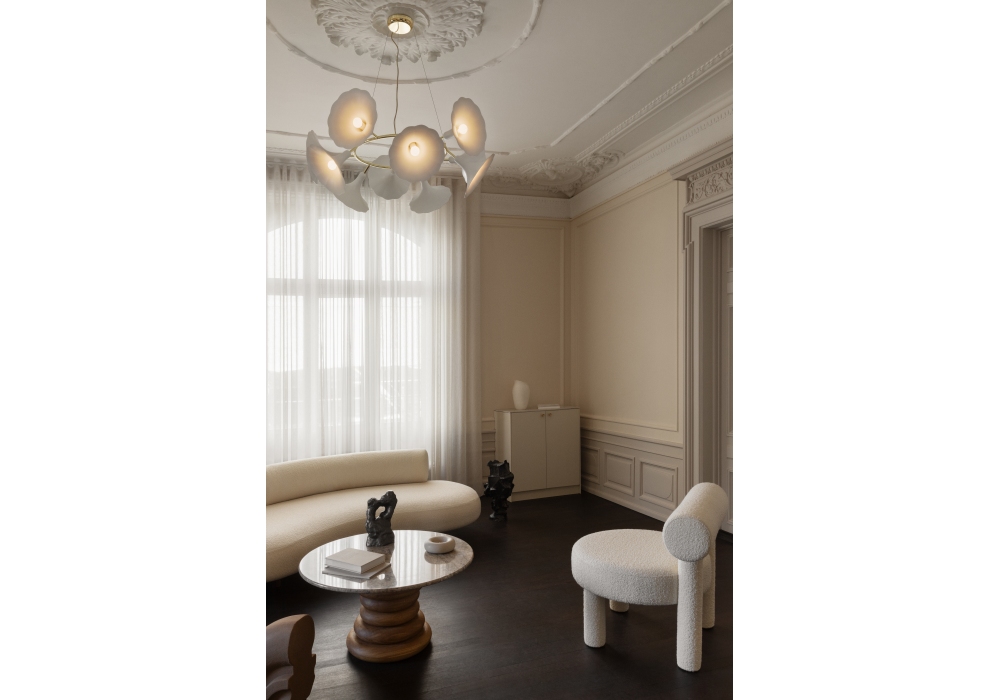 Petalii conçu par Nika Zupanc pour Nuura est un lustre caractérisé par 10 fleurs en métal blanc suspendues à un anneau en métal en laiton poli.
