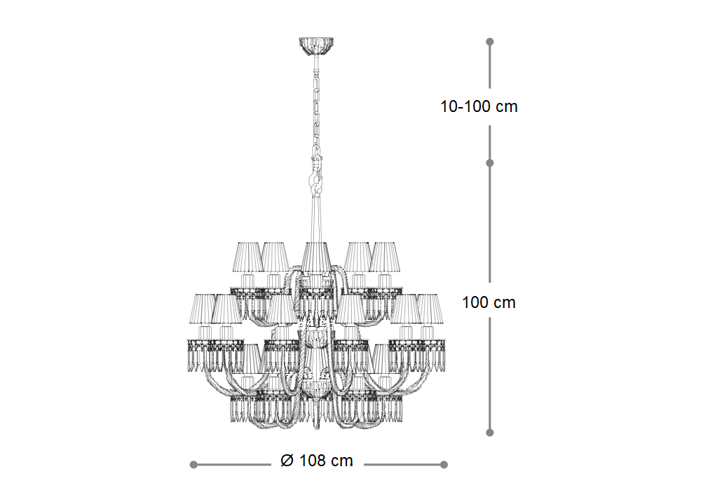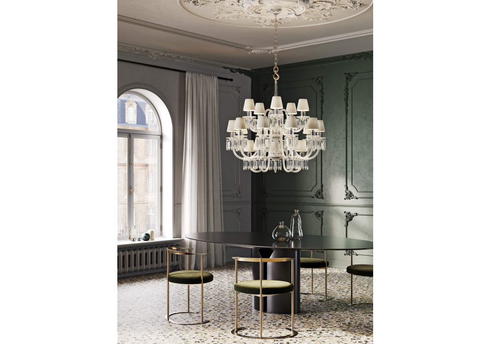 Egle conçu par Roberta Vitadello pour Italamp est un lustre en cristal et verre artistique. Abat-jour en tissu plissé ivoire. Détails métalliques avec finition chromée et détail de fixation avec finition or satiné.