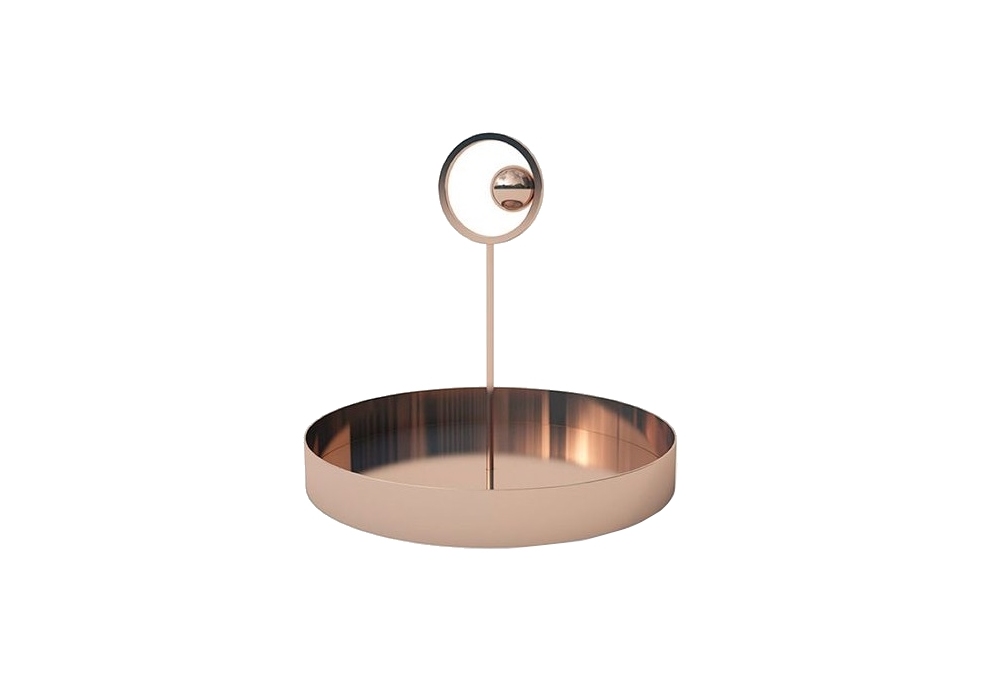 Off the Moon conçu par Thomas Dariel pour Cappellini est un plateau en laiton finition cuivre rose brillant avec poignée tige et sphère décorative.