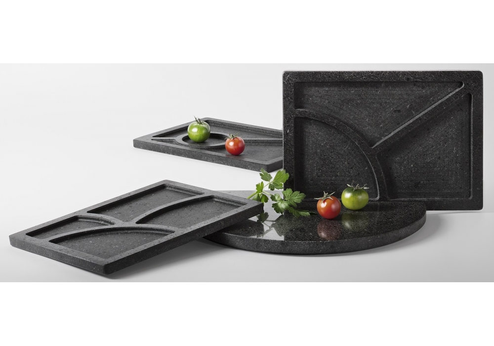 Fidia conçu par C. Virga & I. Virga pour Lithea est un set de plateaux avec planche à découper disponible en 2 finitions.