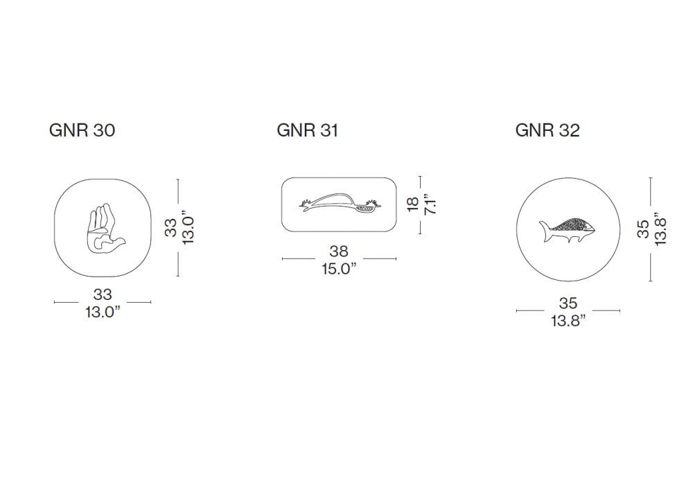 | Dimensions | 33 x 33 cm (La Main Ouverte); 38 x 18 cm (La Course du Soleil); Ø 35 cm (Poisson). |