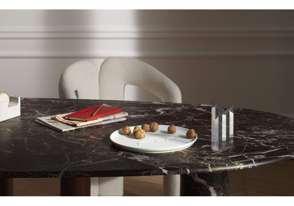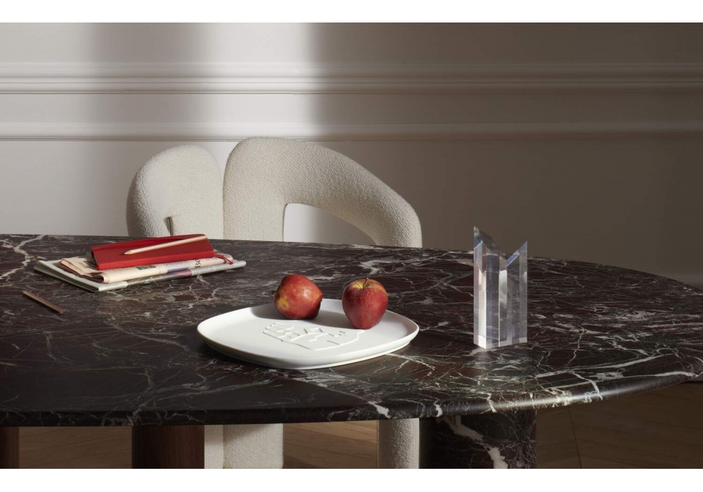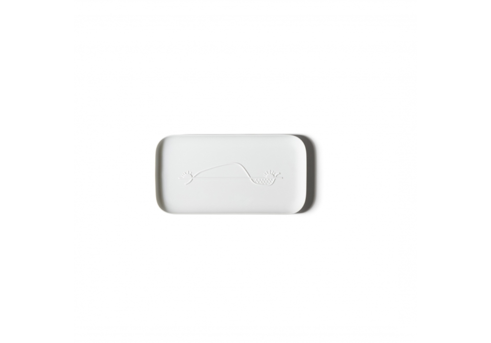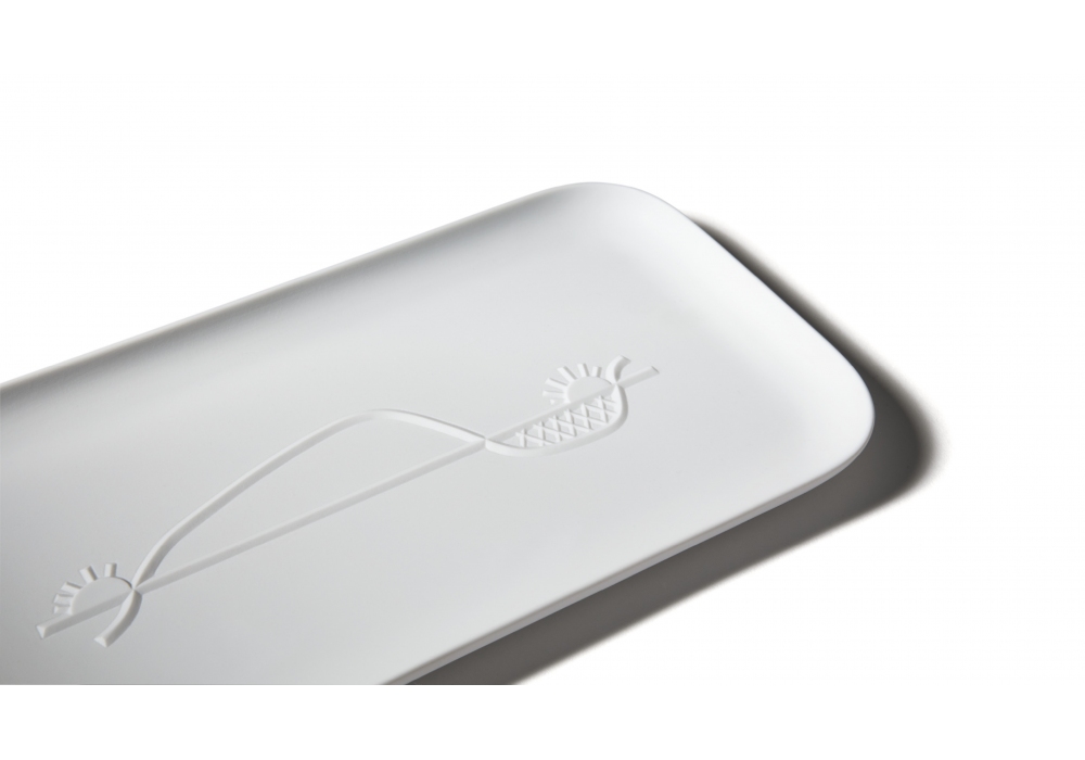 Collection Chandigarh conçue par Le Corbusier pour Cassina est un plateau en pure porcelaine non émaillée, disponible en trois dimensions et avec trois symboles différents en bas-relief.