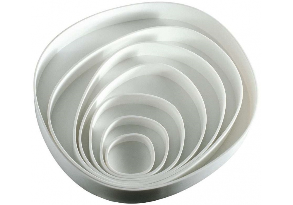 Vertigo Round conçu par Naoto Fukasawa pour B&B Italia est un plateau circulaire avec des bols en résine polyester acrylique blanche.
