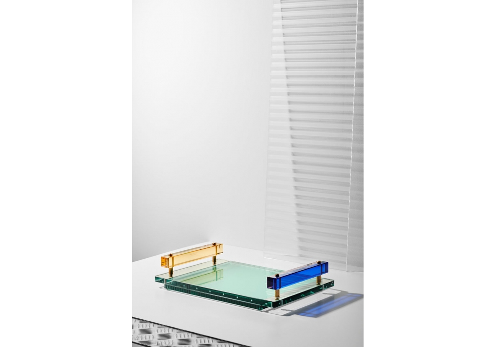 Panama produit et signé par Reflections Copenhagen est un plateau en cristal quadrangulaire structuré par divers éléments géométriques sculptés et finis à la main en transparent, rose, cobalt, jaune et émeraude.
