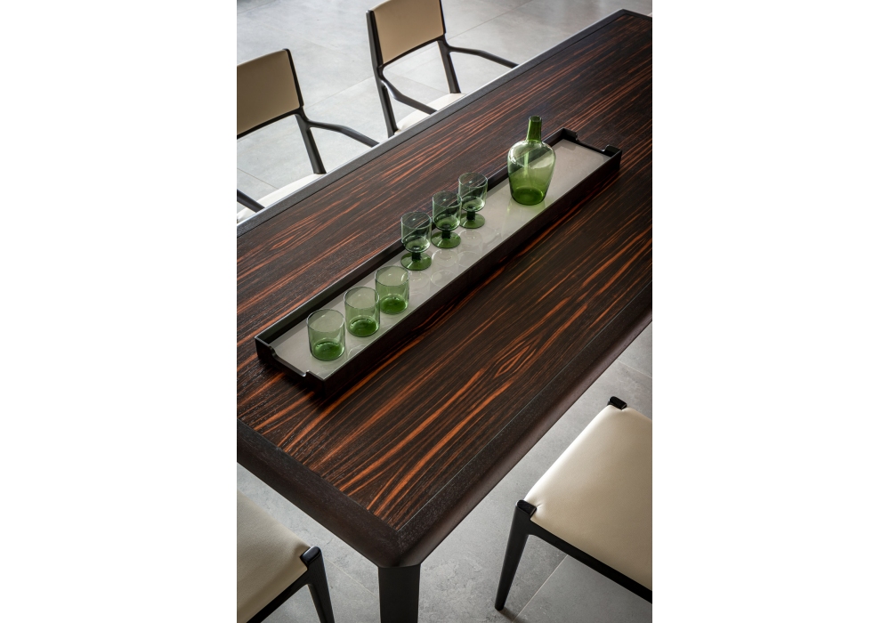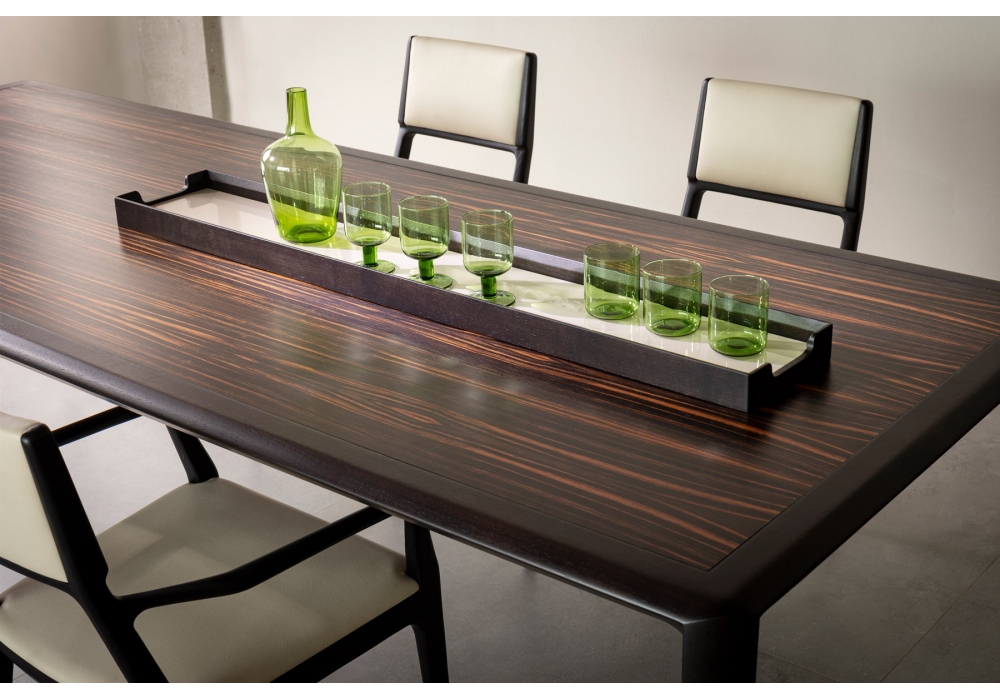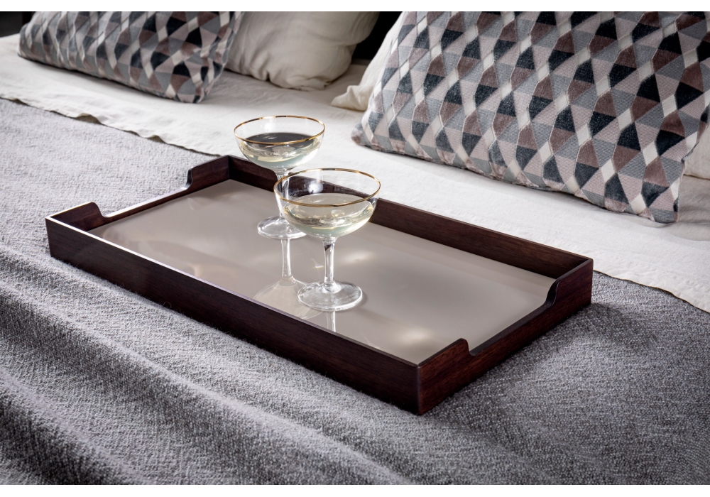 Guscia conçu par le studio de design Ceccotti Collezioni est un plateau de service en noyer américain massif et contreplaqué plaqué. Fond de plateau en verre coloré ou cuir.