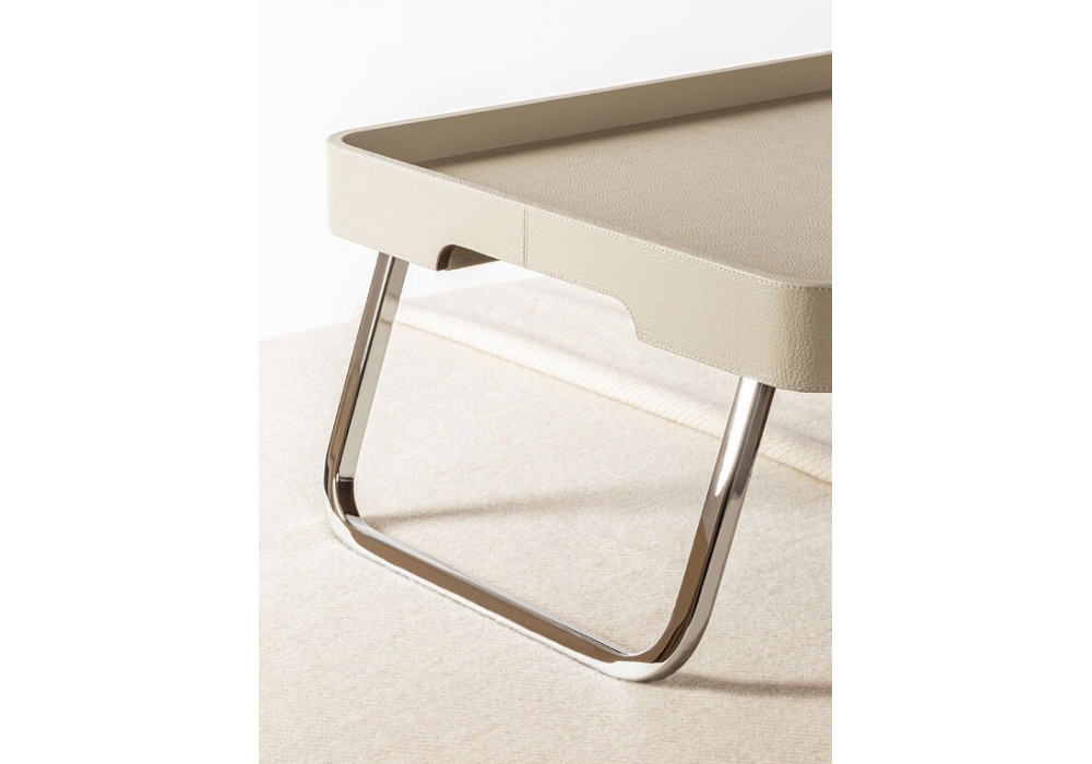 Collection de vaisselle conçue par Giobagnara pour Poltrona Frau est un plateau de lit avec une structure avec pieds pliants en acier chromé et un plateau entièrement recouvert de Pelle Frau®. La collection de vaisselle est disponible en différentes finitions.