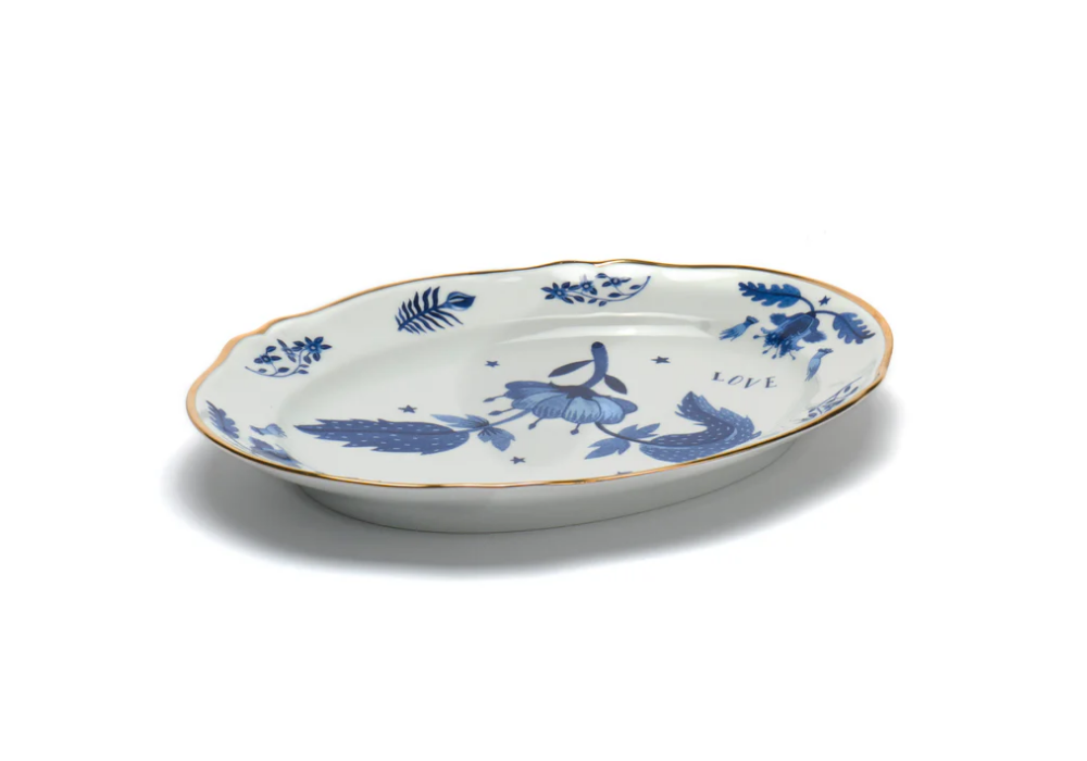 Marino signé par le design Aitch.Ro pour Bitossi Home est un plateau ovale en porcelaine avec des décors et des détails dorés. Convient au lave-vaisselle et à un maximum de 250 lavages. Ne convient pas au micro-ondes.