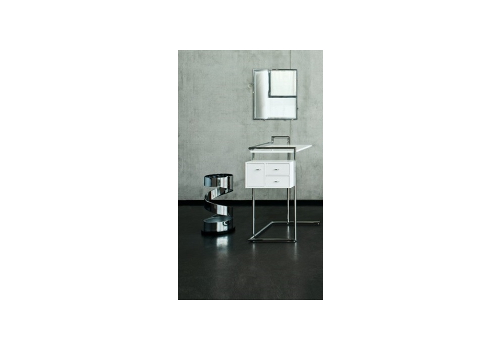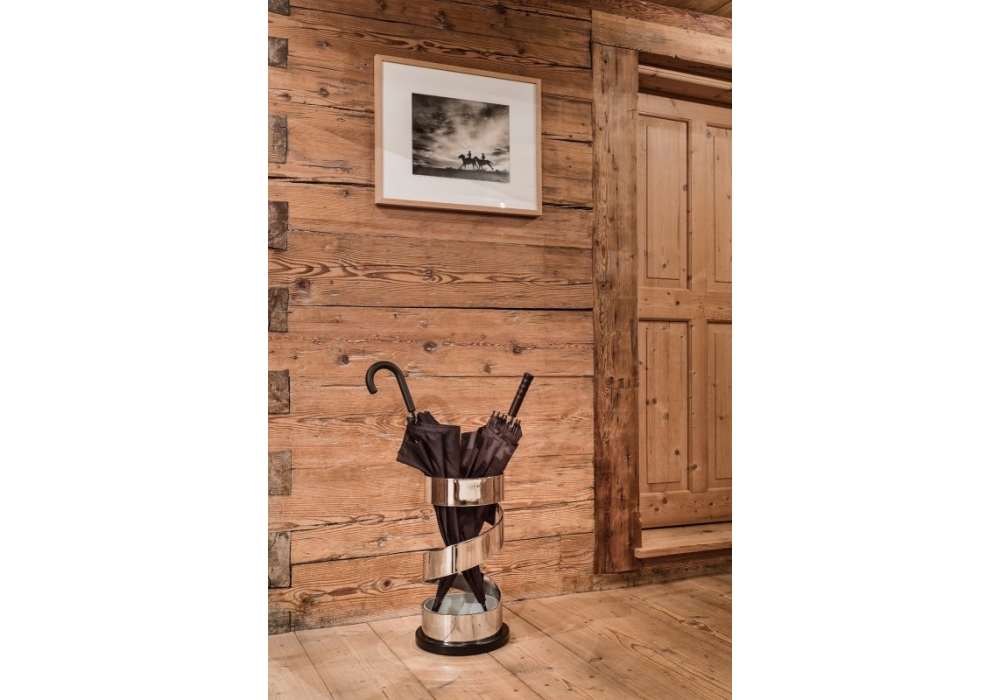 Usha conçu par Eckart Muthesius pour ClassiCon est un porte-parapluies en acier plat chromé. Socle en bois laqué noir satiné.