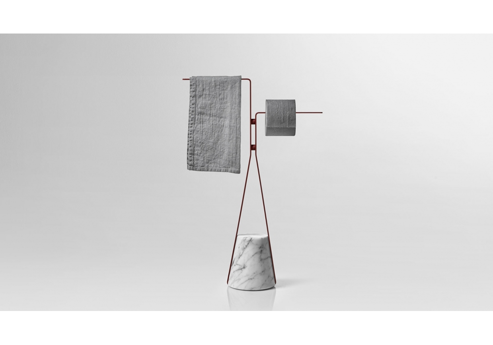 Halo conçu par Calvi Brambilla pour Antonio Lupi est un porte-serviettes réalisé avec une base en marbre de Carrare satiné et une structure en laiton peint en blanc mat ou en relief dans différentes finitions.