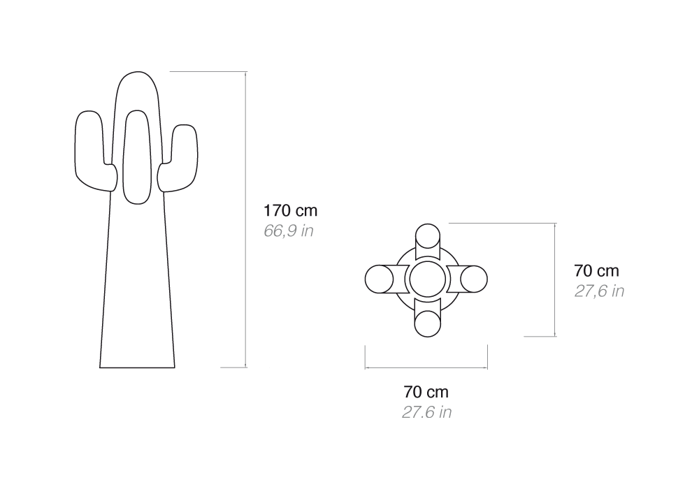 Nerocactus conçu par Guido Drocco et Franco Mello pour Gufram est un cintre en mousse de polyuréthane traitée avec Guflac, peinture lavable à l'eau. Sujet à d'innombrables interprétations libres et souvent équivoques, Cactus est l'icône du design italien qui a révolutionné le paysage domestique en bouleversant les frontières entre l'intérieur et l'espace ouvert. Cactus se présente comme un totem ironique.