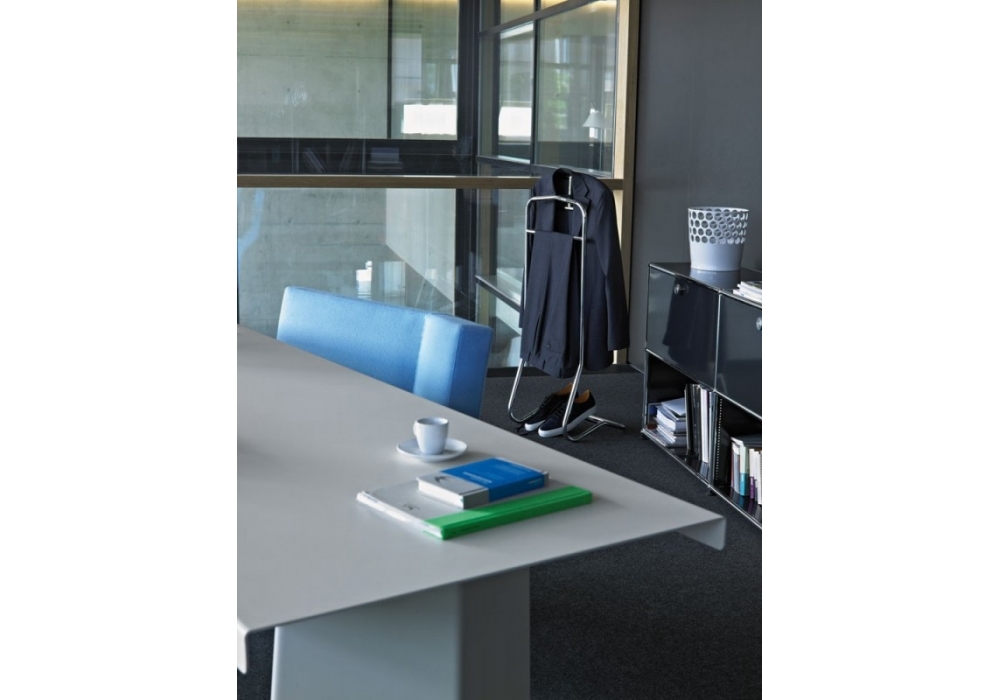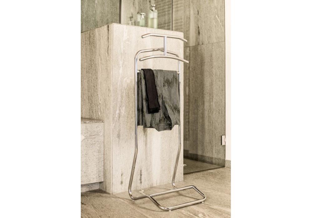 Mandu conçu par Eckart Muthesius pour ClassiCon est un beau valet de nuit en tube d'acier. Bande anti-dérapant en silicone pour les pantalons. Patins en plastique.