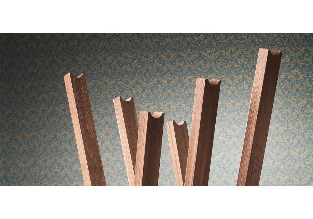 Oscar conçu par Angelo Tomaiuolo pour Cattelan Italia est un portemanteau en bois disponible en noyer Canaletto ou en chêne brûlé. Base en travertin naturel.