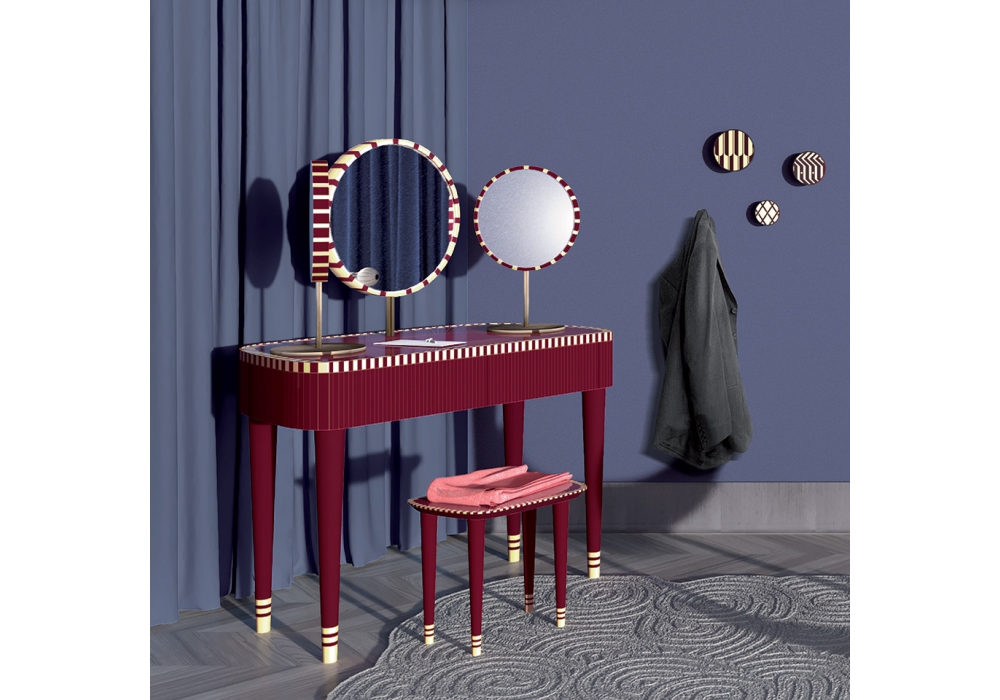Otello conçu par Matteo Cibic pour Scarlet Splendour est un portemanteau avec trois chevilles murales en MDF, contreplaqué, incrustation de résine et métal.