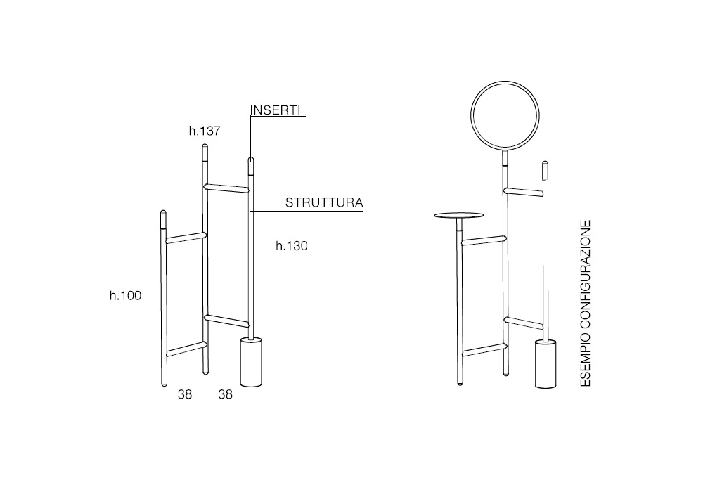Dressme conçu par Davide Negri pour Minotti Italia est un valet en tube de fer avec finition en relief de couleur anthracite, inserts en métal satiné disponible en nickel ou en laiton peint.