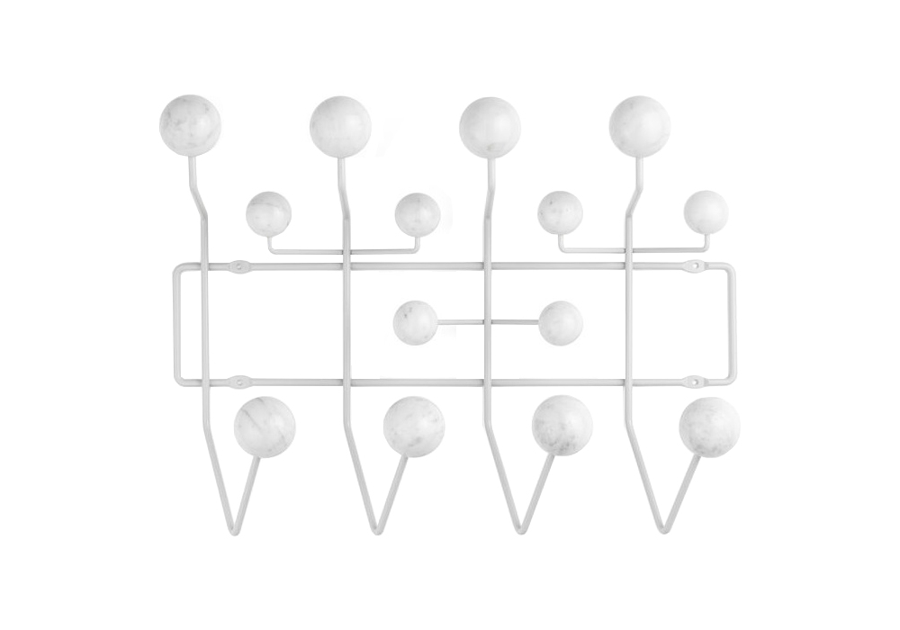 Hang It All conçu par Charles & Ray Eames pour Vitra est un portemanteau en édition limitée composé d'une structure en acier gris clair et de billes de marbre blanc de Carrare.