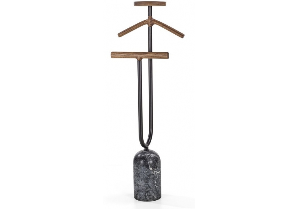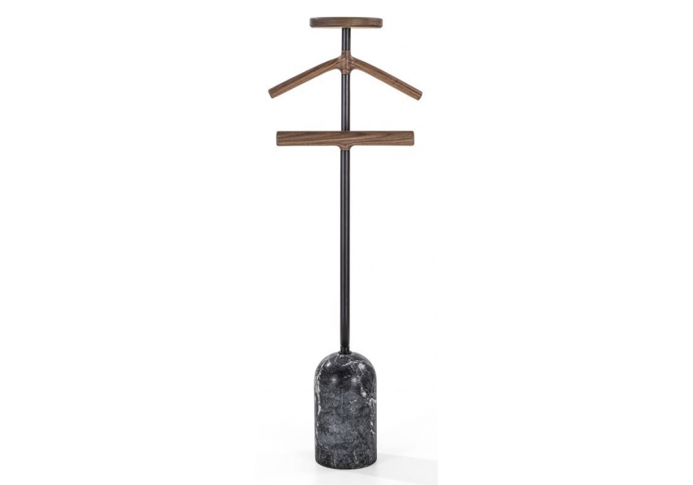 Ekero Rack conçu par Tollgard & Castellani pour Porada est un valet de nuit en noyer Canaletta massif, base en marbre et structure en métal peint. Tige de pantalon avec insert en microfibre antidérapant et vide-poches recouvert de cuir Cuoietto.