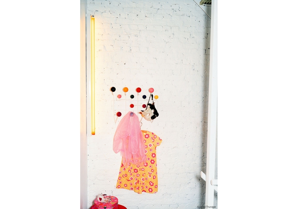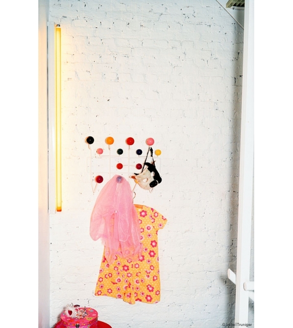 Vitra Hang il all: Des boules de bois aux couleurs vives qui remplacent les simples patères doivent inciter les enfants à y suspendre « toutes leurs affaires », comme l'indique le nom de l'objet. Grâce à l'espace régulier qui sépare les boules, le Hang It All peut être étendu à l'infini. C'est une solution alternative ludique aux crochets monotones des portemanteaux, aussi bien dans la chambre des enfants qu’ailleurs.