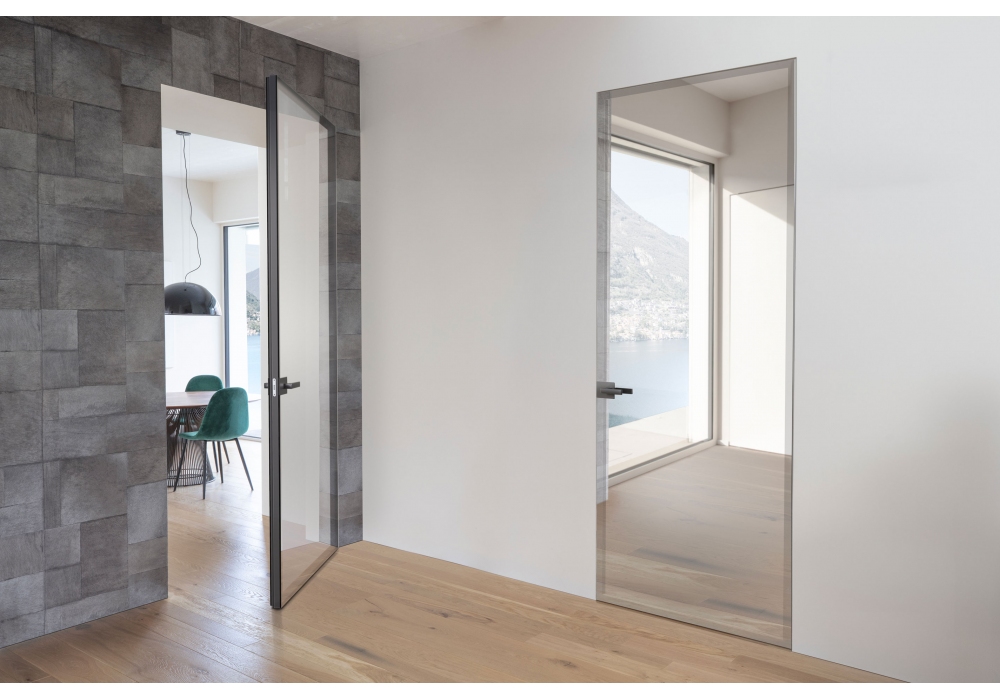 Como Vetro Doppio conçue par Viva est une porte battante à double vitrage, avec porte et cadre en aluminium. Disponible en différentes finitions.