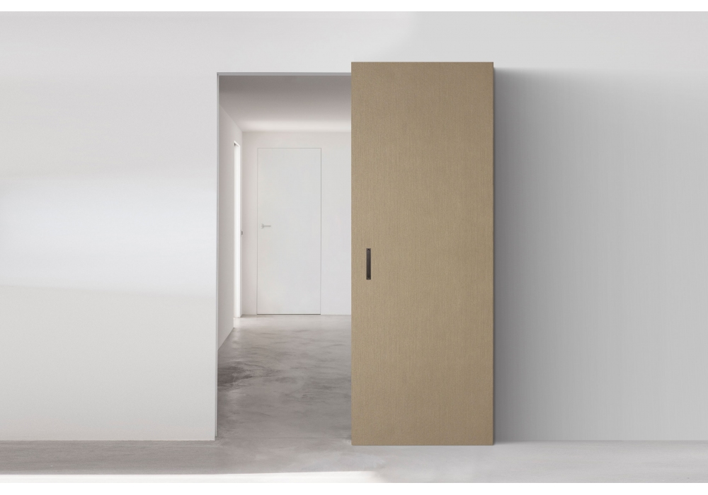 VSE Minima conçue par Viva est une porte avec porte coulissante à l'extérieur du mur, sans rail visible. Laque mate, brillante ou bois. Disponible en différentes finitions.