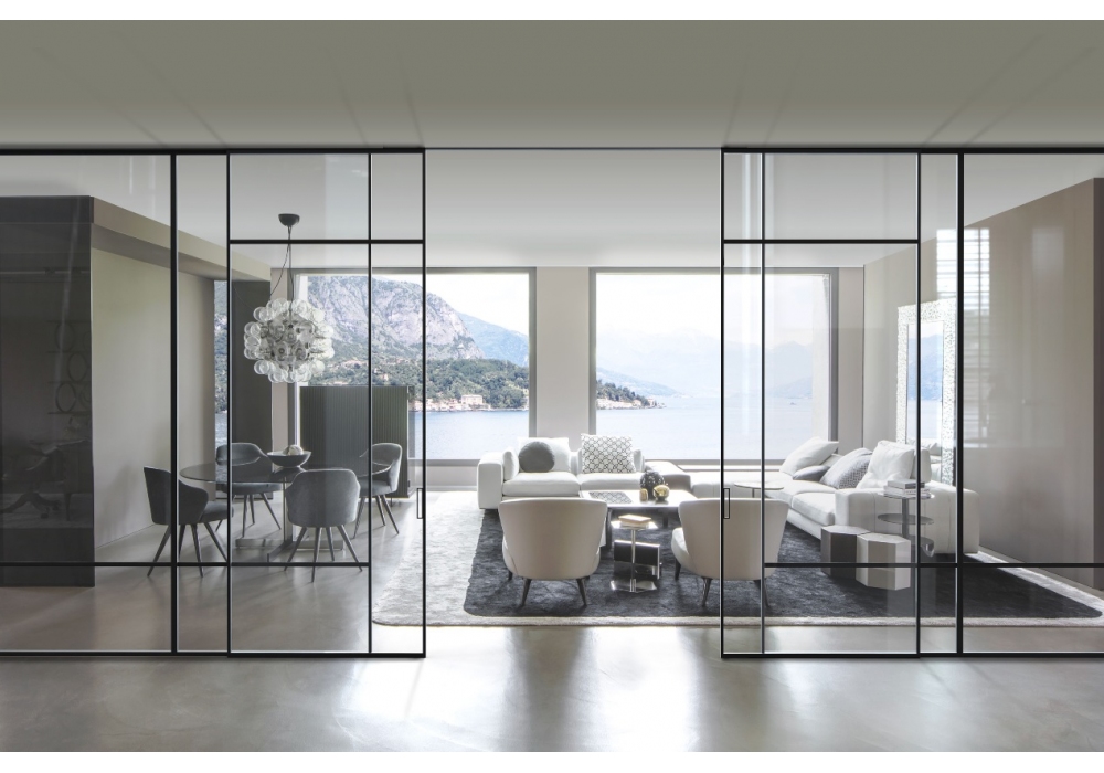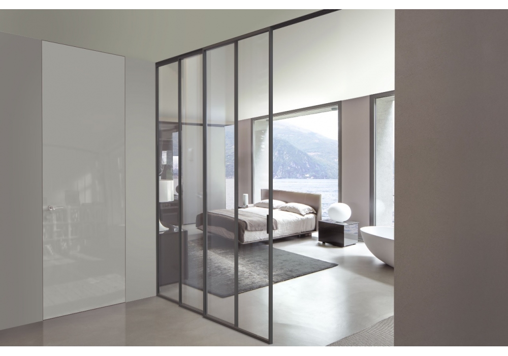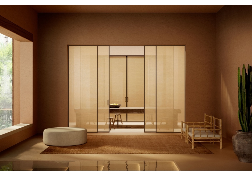 Bellagio conçue par Viva est une porte coulissante en verre ou avec revêtement en tissu. Châssis en aluminium. Disponible en différentes finitions.