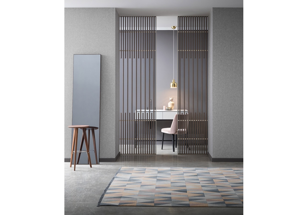 Koan conçue par Kokaistudios pour Lualdi est une porte coulissante en verre, bois et aluminium.Cette porte coulissante pour l'intérieur présente une combinaison inédite de lames verticales qui alternent sur des longueurs variables. Disponible en différentes finitions.