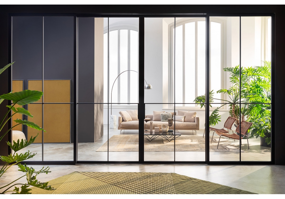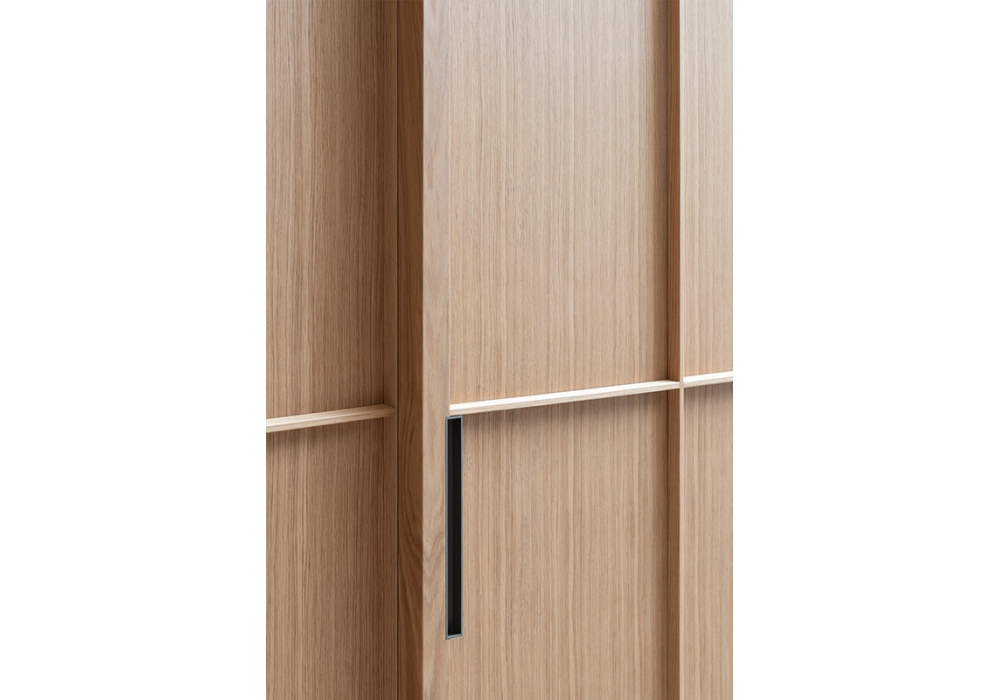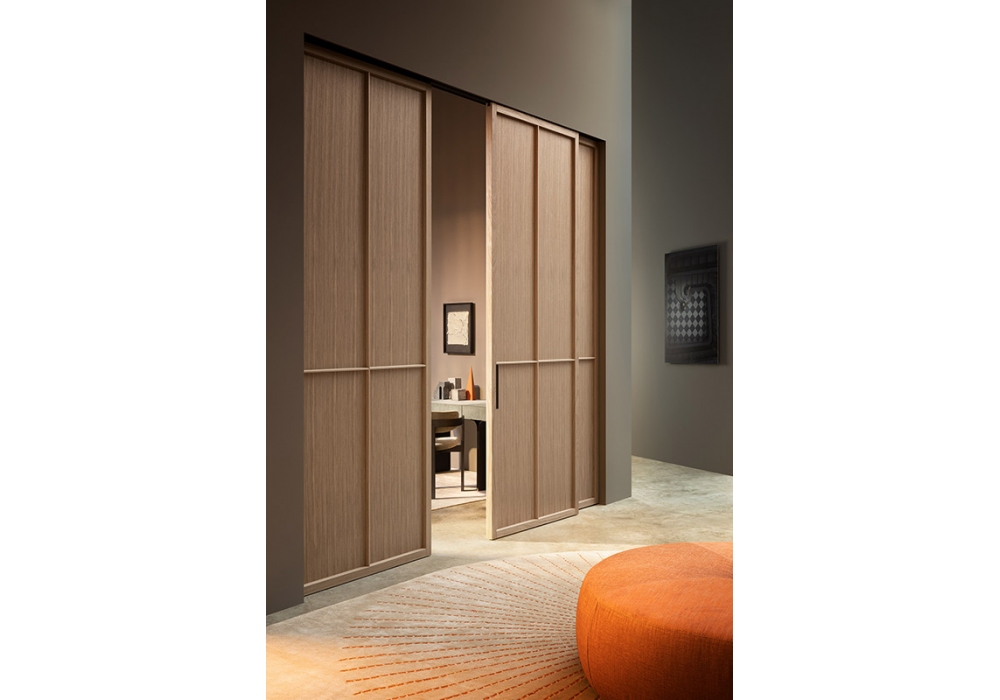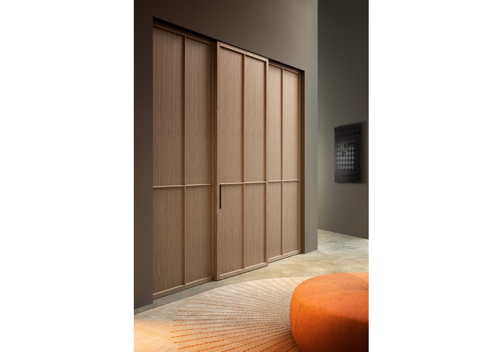 Skye conçue par Piero Lissoni pour Lualdi est une porte avec un système de panneaux fixes et coulissants, en bois et verre. Disponible en différentes finitions.