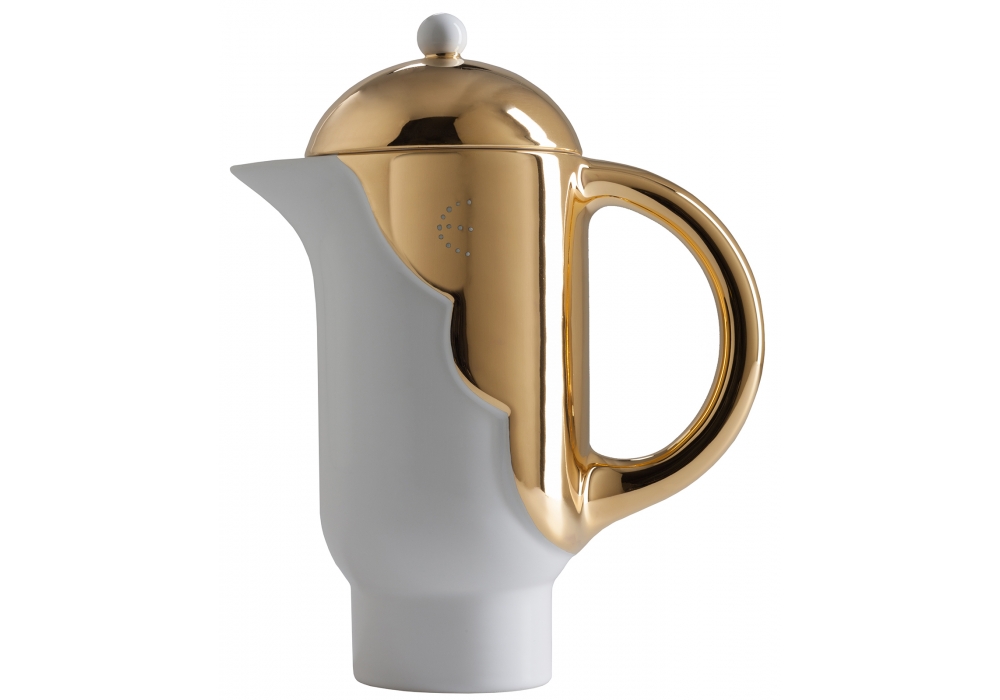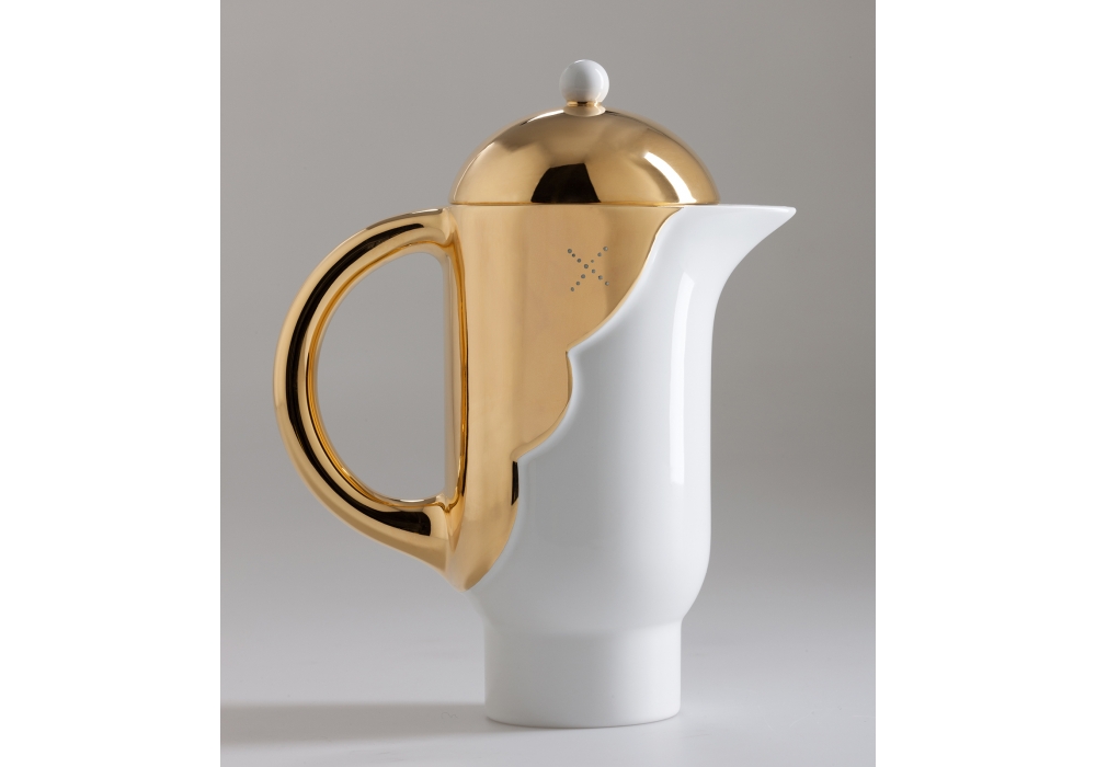 Decanter conçue par Jaime Hayon pour Bosa est une carafe en céramique blanche avec détails en or brillantes. Table collection comprend aussi assiettes, tasses, boules et kit de sel et de poivre.