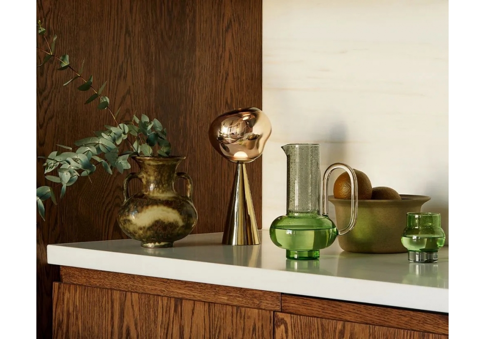 Bump Jug Green conçu par Tom Dixon est une cruche en borosilicate.