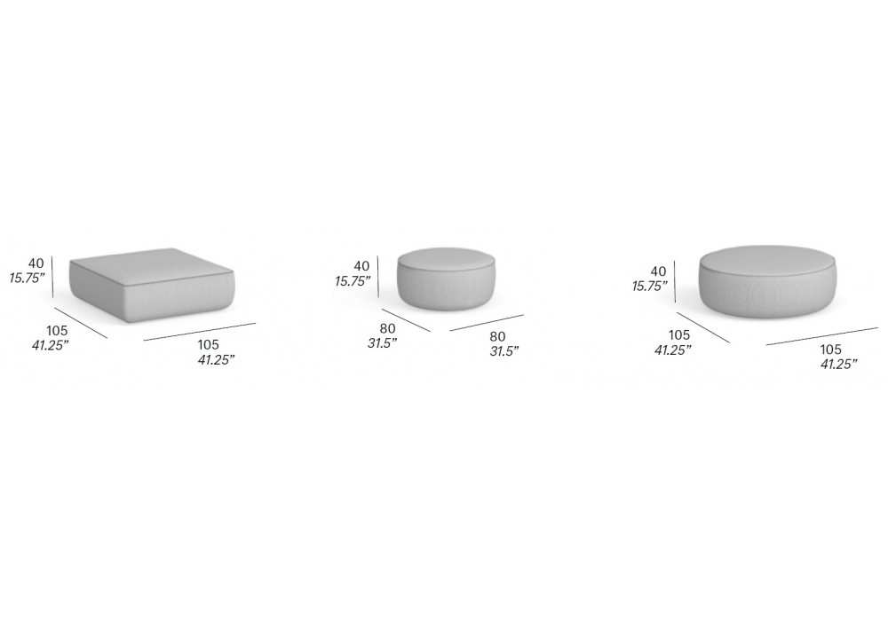 | Dimensions | • 105 x 105 x H 40 cm; • Ø 80 x H 40 cm; • Ø 105 x H 40 cm |