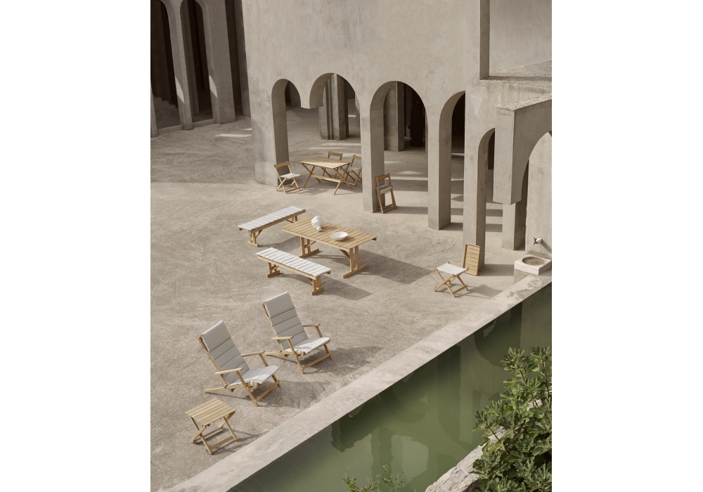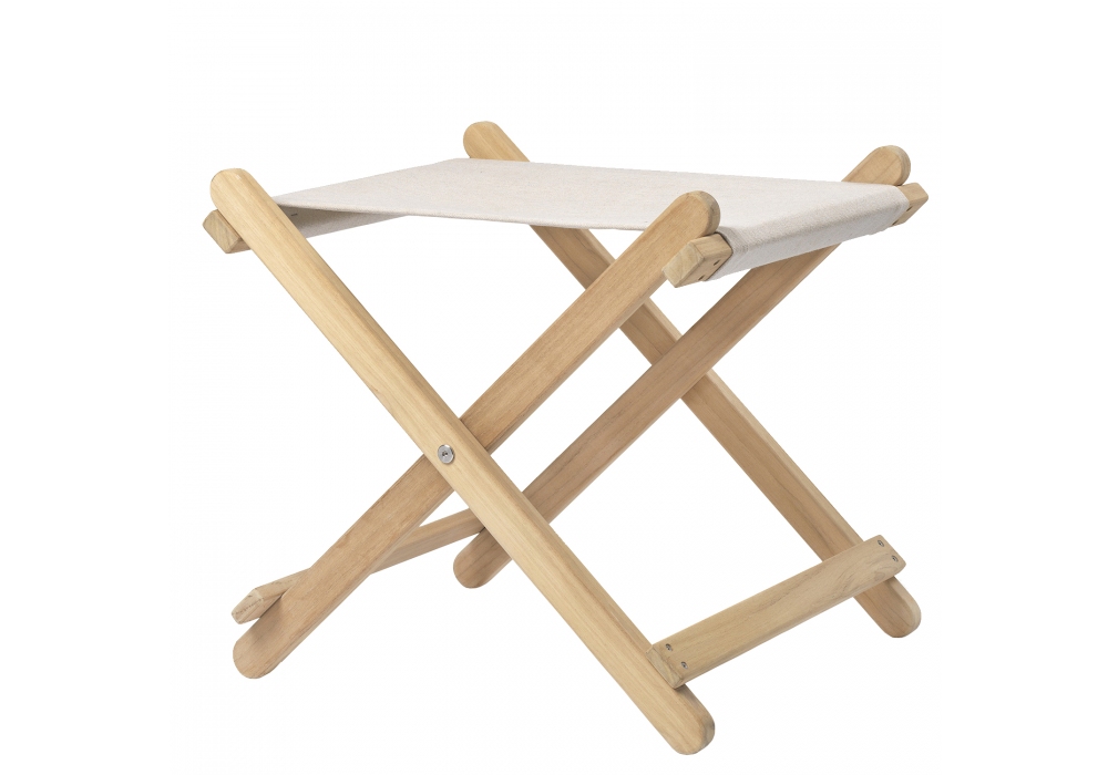 BM5768 conçu par Børge Mogensen pour Carl Hansen & Søn est un repose-pieds d'extérieur pliable avec une structure en teck massif non traité et un tissu Heritage Papyrus 18006. Les articulations sont toujours en acier inoxydable. Plateau en option.
