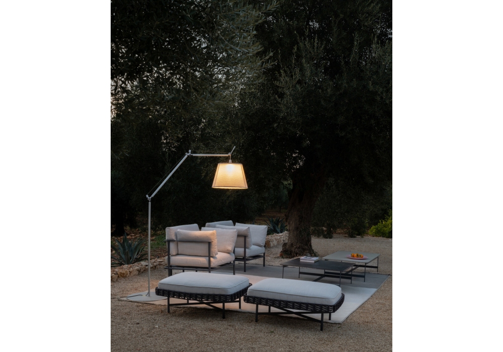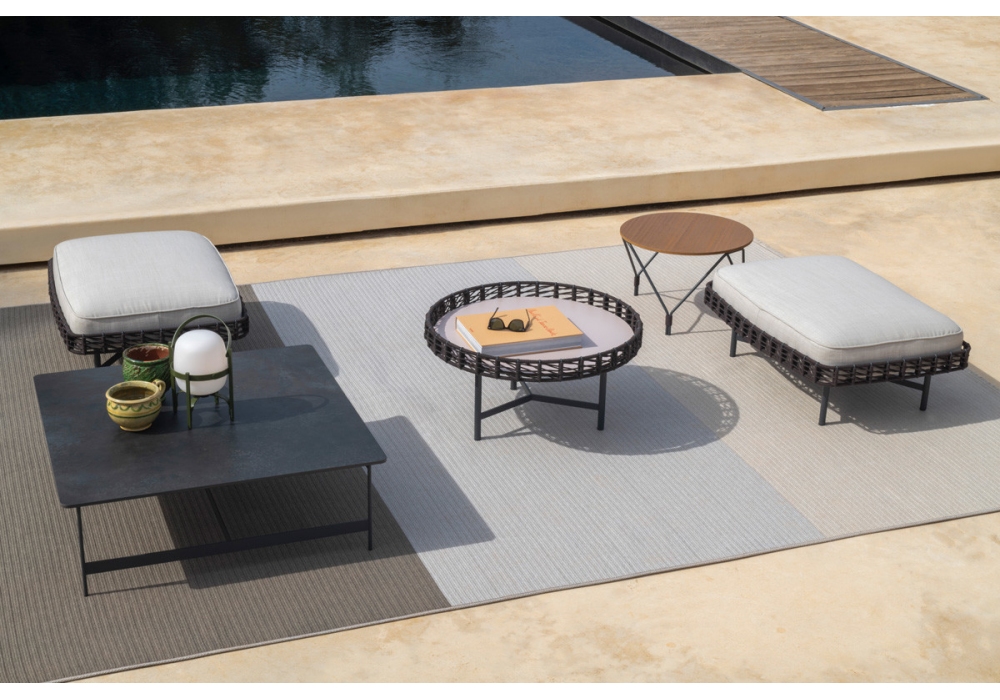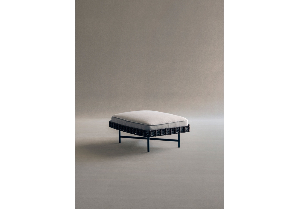 Ropu Outdoor conçu par Chiara Andreatti pour Potocco est un pouf rectangulaire pour l'extérieur avec structure en métal peint anthracite gaufré et cadre avec tressage en cordon "Gassa" marron foncé. Coussin amovible recouvert de mousse de polyuréthane ignifuge recouvert de divers tissus.