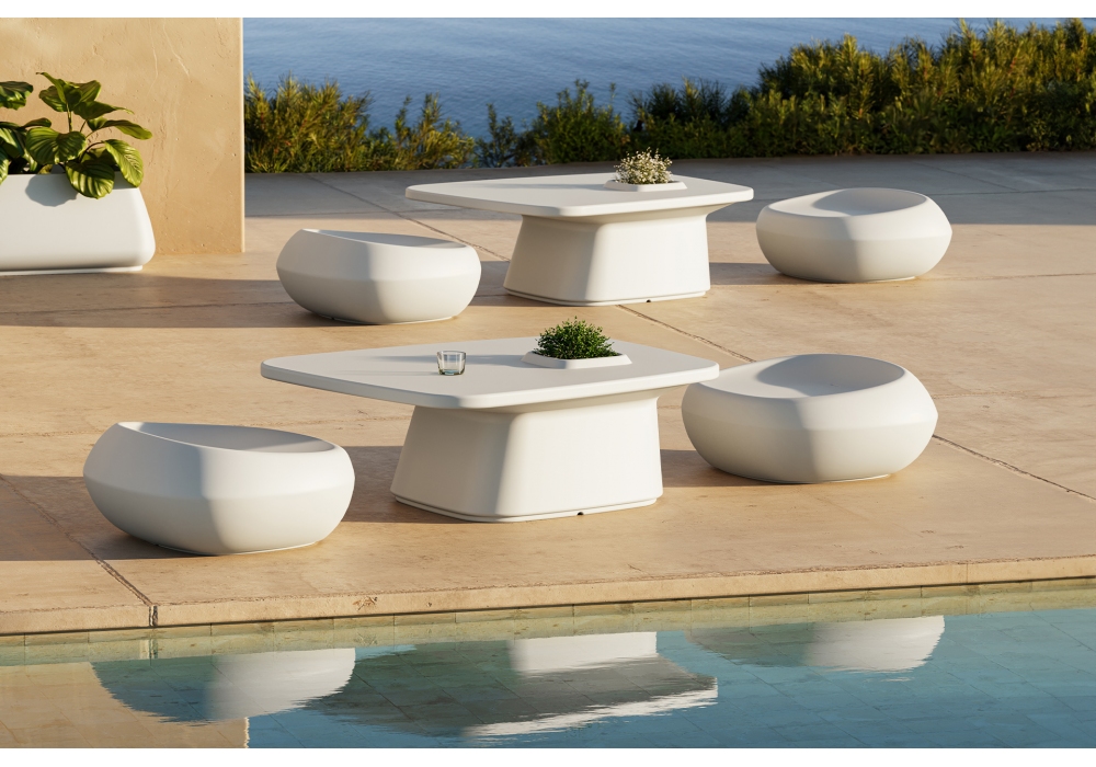 Noma Low conçu par Javier Mariscal pour Vondom est un pouf en résine de polyéthylène avec une finition mate ou laquée ou avec un éclairage LED RGBW interne avec batterie. Disponible en différentes finitions.