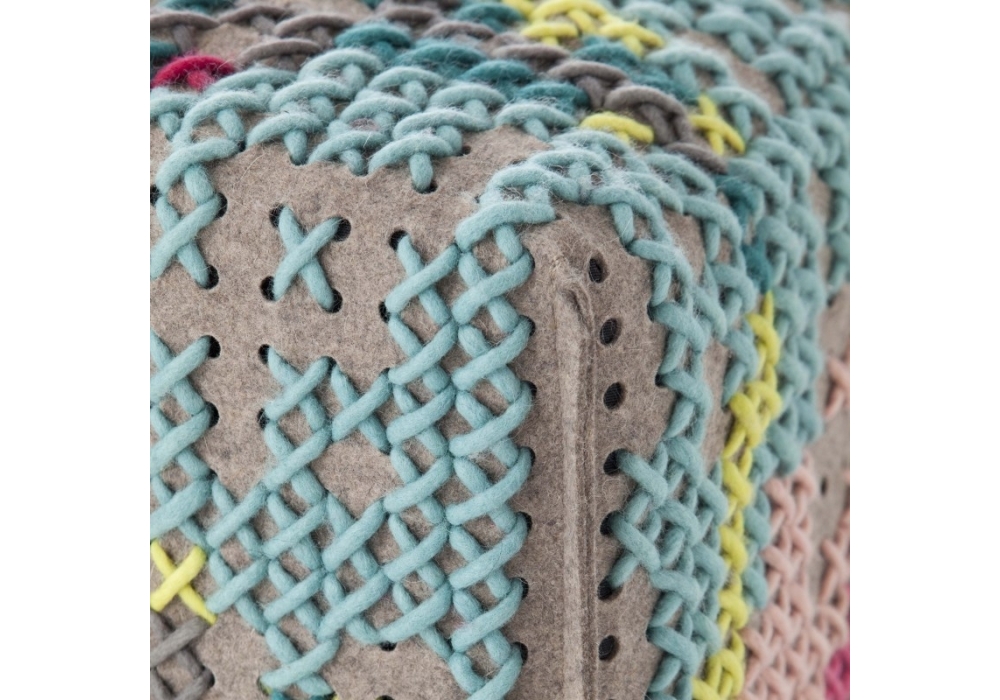 Canevas Flowers Square conçu par Charlotte Lancelot pour Gan est un pouf avec structure en bois, rembourrage en mousse et revêtement 100% laine. Disponible en deux finitions.