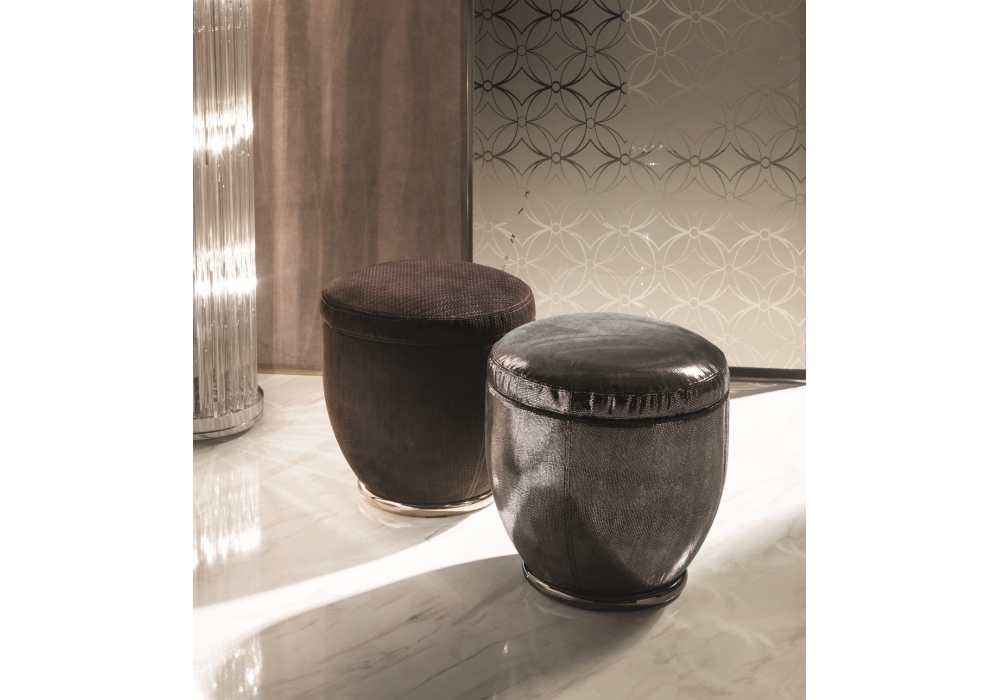Godwin conçu par Giuseppe Iasparra pour Longhi est un pouf avec structure en fibre de verre et assise en bois et mousse de polyuréthane haute densité. Base en métal en différentes finitions. Revêtement en tissu ou cuir non déhoussable.