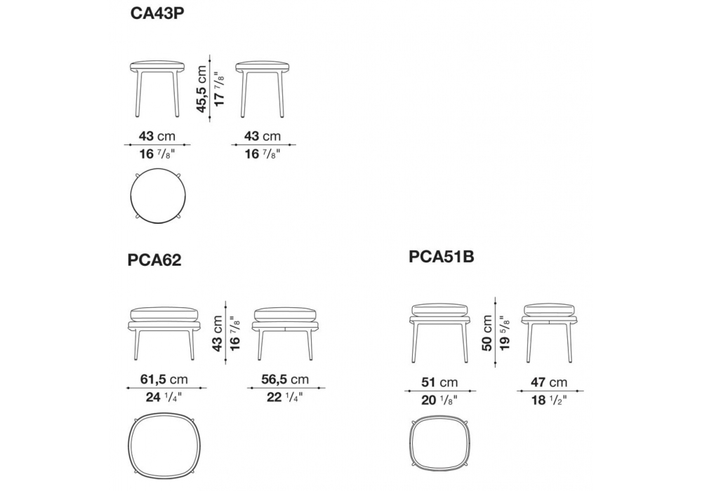 | Dimensions | Ø 43 cm x H 45.5 cm; 61.5 x 56.5 x H 43 cm; 51 x 47 x H 50 cm. |