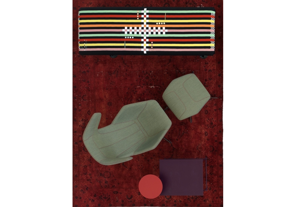Take a Line for a Walk conçu par Alfredo Häberli pour Moroso est un pouf réalisé en polyuréthane expansé avec structure en bois et base pivotante à 4 rayons peints. Revêtement en différents tissus ou cuirs.