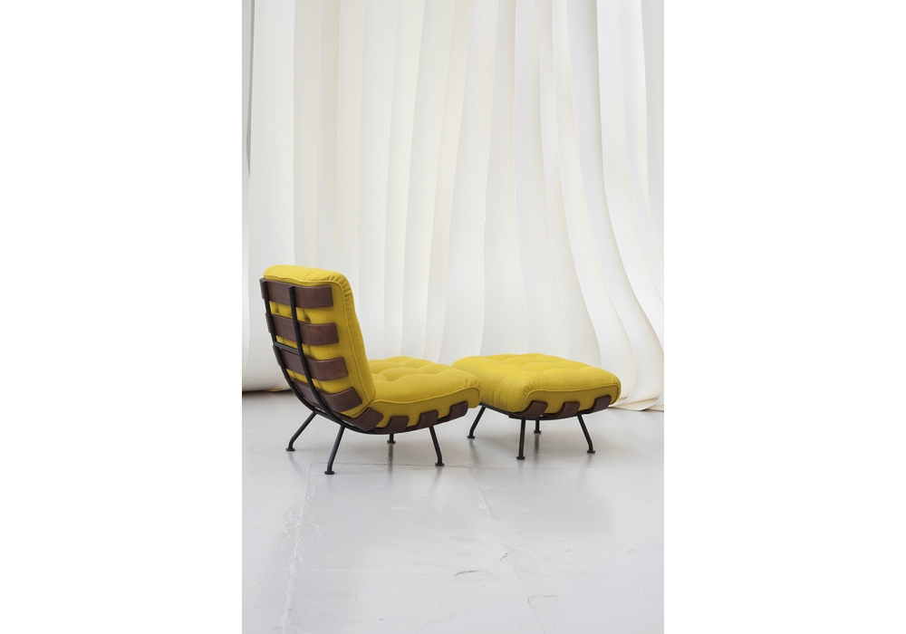 Costela conçu par Martin Eisler pour Tacchini est un pouf avec structure réalisée avec des lattes en frêne teinté à pores ouverts de différentes couleurs. Base en métal peint. Housse non amovible, disponible en tissu ou en cuir de différentes couleurs.