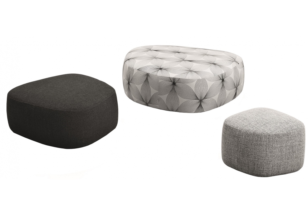 Pierre conçue par Studio Contromano pour Flou est une collection de poufs rembourrés aux formes irrégulières. Revêtement déhoussable en tissu ou cuir avec coutures à vue qui mettent en valeur l’arrondi.