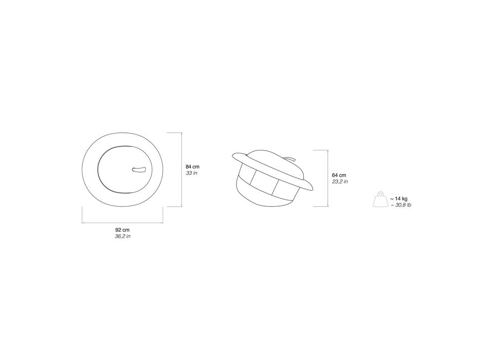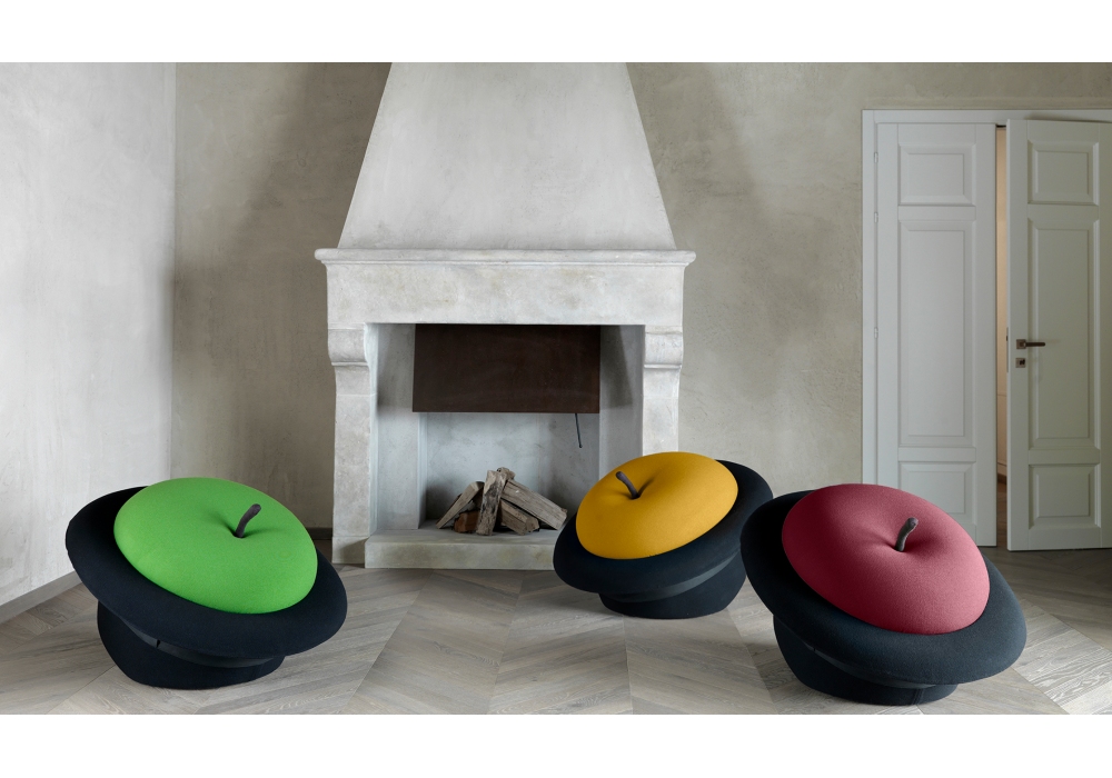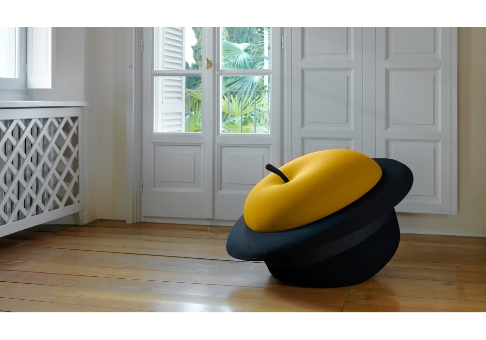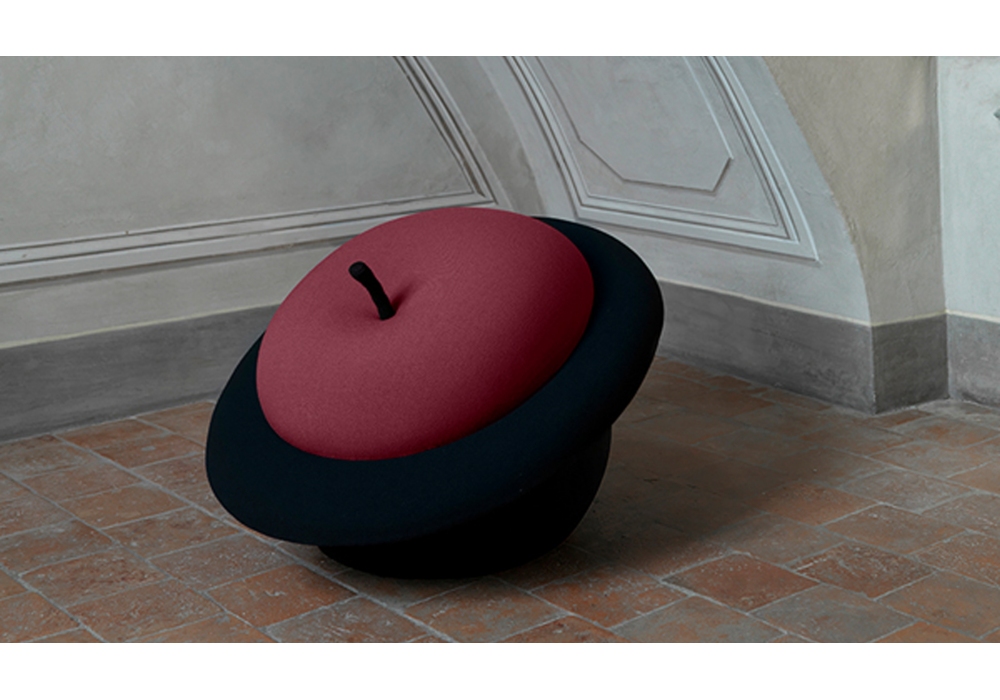 Magritta conçu par Sebastiàn Matta pour Gufram est un pouf représentant une pomme dans un cheveu noir, un hommage au célèbre tableau de René Magritte. Fabriqué avec un rembourrage en mousse de polyuréthane et un revêtement en laine bouclée disponible en différentes finitions.