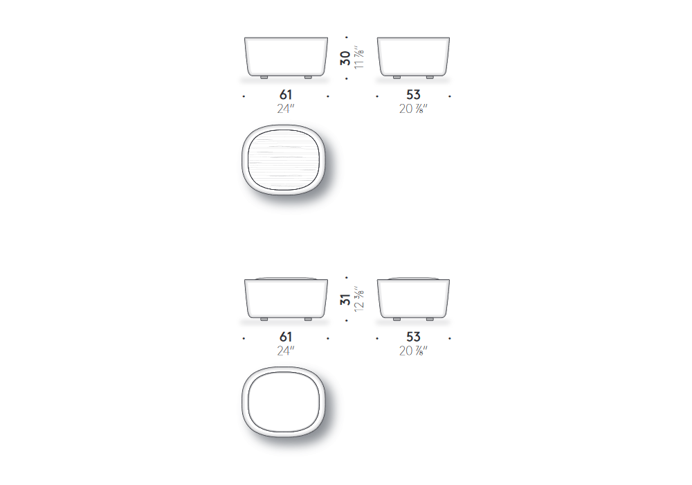 Ripamonti conçu par Keiji Takeuchi pour De Padova est un pouf dont la structure est en contreplaqué de bouleau, polimex, mousse de polyuréthane et ouate de polyester recouverte de velours de polyester. Il est disponible en deux modèles avec coussin d'assise ou avec plateau. Disponible avec différents tissus, cuir ou dessus.